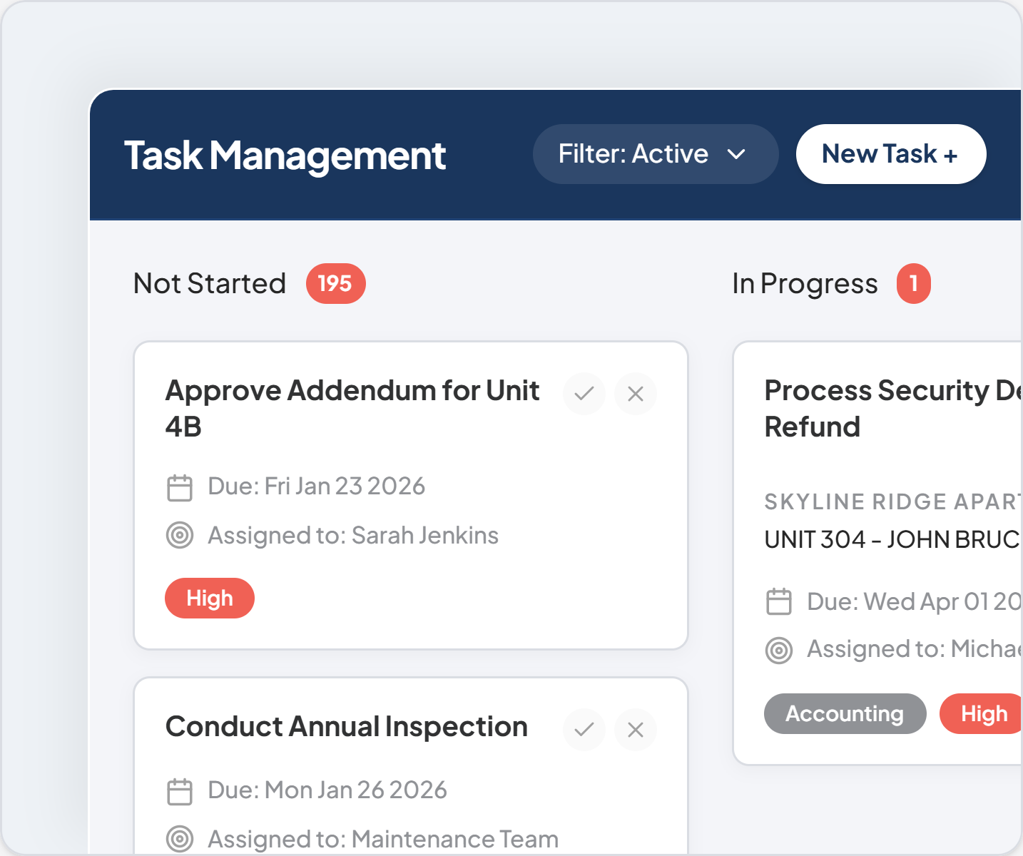 Keep your team aligned with organized to-do lists. Track progress across Not Started, In Progress, and Completed stages with automated reminders.