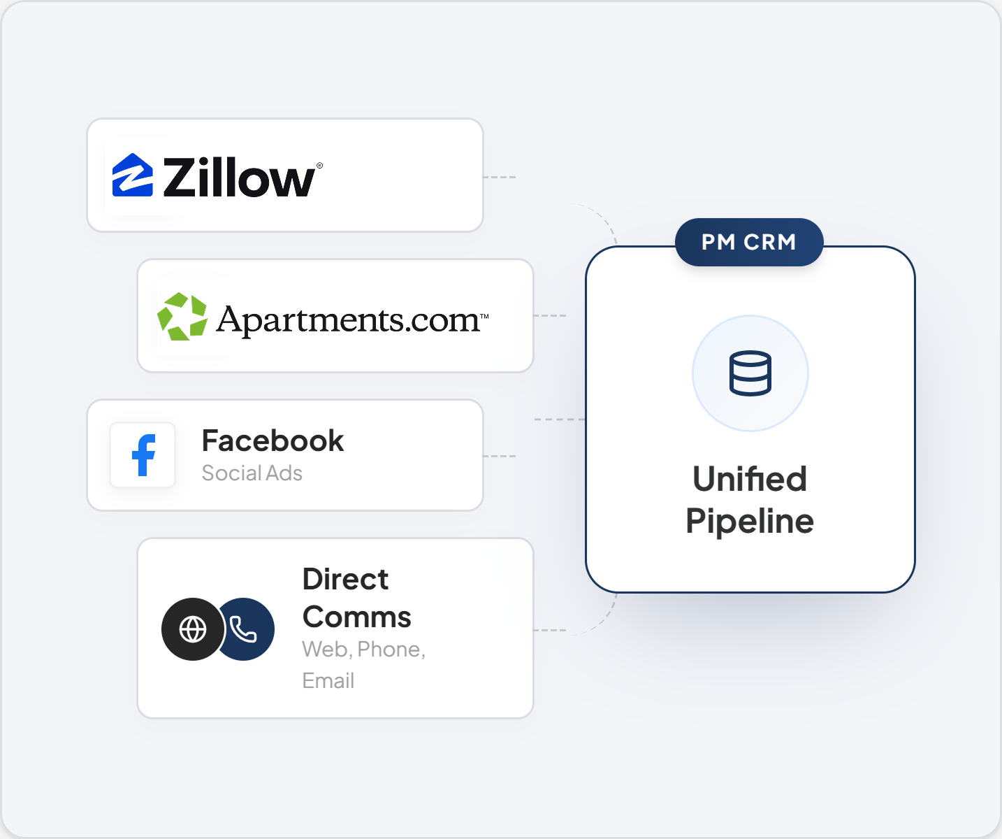 Zillow, Apartments.com, Facebook, Craigslist, web forms, inbound calls, and email all flow into one pipeline.